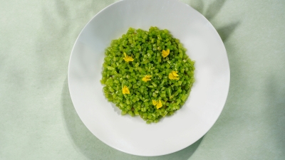 Pan-Fried Fresh Chinese Chives with seafood features tender spring chives, finely chopped and pan-fried with fresh seafood until crisp on the outside and tender within, an expression of seasonal simplicity at its most satisfying. Braised Spring Bamboo Shoots with seafood stuffing in superior broth presents tender bamboo shoots filled with delicate shrimp paste, enriched with black truffle. Slowly simmered in superior broth, the dish brings together the natural sweetness of bamboo, the richness of seafood, and the depth of truffle in a refined composition. Pandan Lemongrass Jelly blends the freshness of pandan with the aromatic brightness of lemongrass, offering a smooth and refreshing finish with layered fruit and herbal nuances.