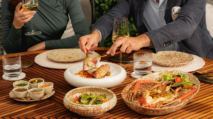 Guests can indulge in perfectly grilled meats and seafood such as Songkhla River Prawn with Barbecued Okra and Burnt Cherry, Salt-Crusted Whole Sea Bass with Torch Ginger and Tea Leaves, and the indulgent Thai-Spiced Butter-Aged Wagyu Ribeye (400 gram) served with Nam Prik Ong and BBQ Long Chilli. Sharing dishes include Grilled Red Grouper with Fermented Soya Bean, BBQ Ratchaburi Organic Pork Ribs, and Thai Gulf Squid with Roe and Spicy Winged Bean Salad.