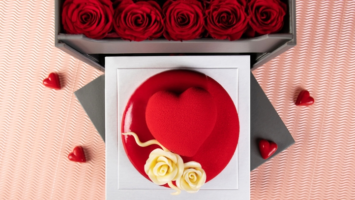 甜食,是令人放松心灵的灵丹妙药。大堂酒廊美食店限时推出情人节“玫瑰之恋”蛋糕礼盒。25朵热情绽放的红玫瑰及口感软绵巧克力蛋糕。把爱意藏进玫瑰与蛋糕中。完美诠释着恋爱时的浓情蜜意,不管是巧克力的浓烈或者玫瑰花的热情,流淌无尽的浪漫。