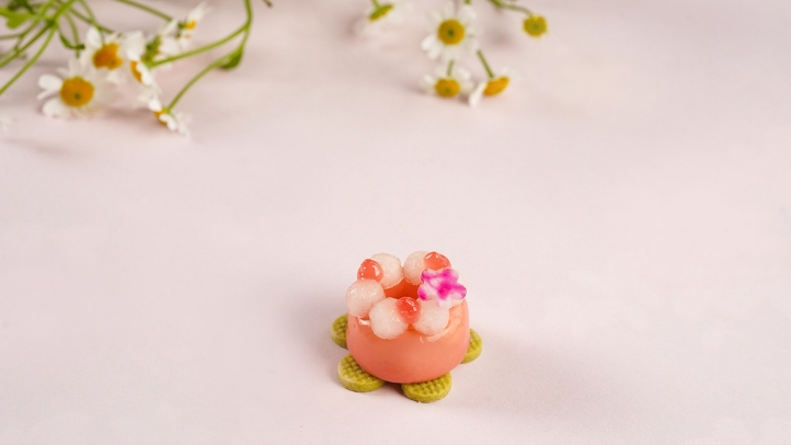 甜點清新,治愈間滿是花事初綻的甜香。精巧靈動的櫻花造型是白桃香檳慕斯,白桃、覆盆子的酸甜層層遞進,再裹挾著香檳的甘冽酒香,入口即化,余韻悠長。櫻桃芝士蛋糕綿密絲滑,濃郁芝士與櫻桃融合,點綴少許開心果碎,綿密中有迸發驚喜的堅果香脆。香草聖托諾黑自帶浪漫氛圍,輕裹脆殼,咬下迸發出香草純粹的甜潤綿滑。斑斕蛋糕將天然清新的綠意嵌入柔軟濕潤的糕體,與蜜桃、芭樂交織出新生草木的澄澈清香。