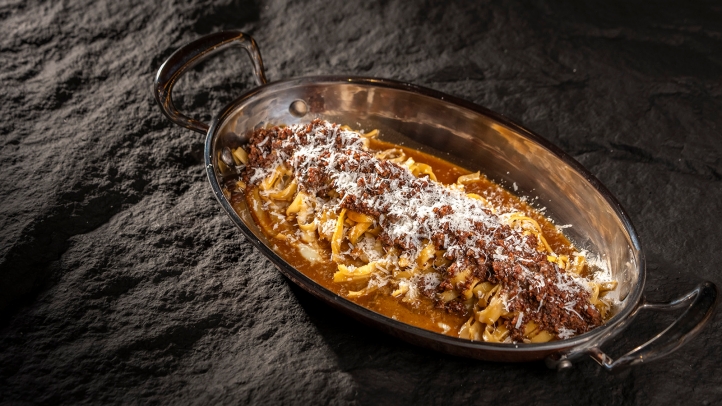 La Fiorentina, Florence’s famed charcoal-grilled Porterhouse steak, arrives with little adornment: just Italian salt, olive oil and black pepper. Using Australian M7 Wagyu, the steak is cooked at an extremely high temperature to develop a deeply caramelized crust while preserving its natural juices, then finished with rosemary smoke. “The focus is always on the quality of the ingredient itself,” says Chef Francesco. “Our technique is there to enhance what’s already excellent. Sauces can be complementary, but we season simply because we want the customer to taste how good the steak really is.”