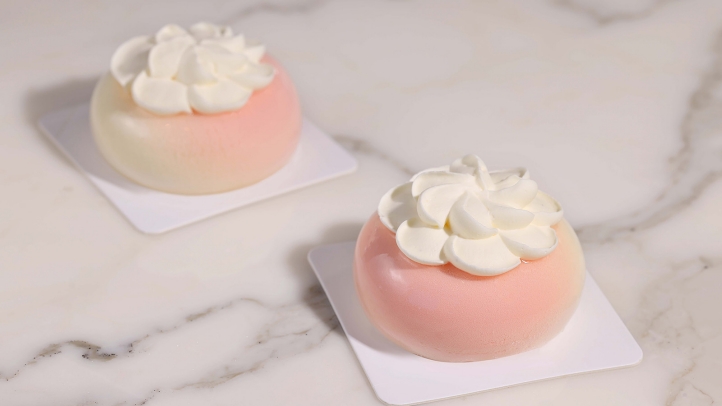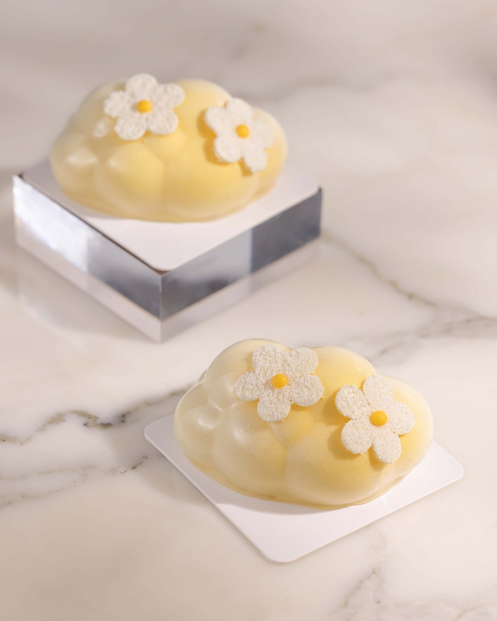 Bright and uplifting, the Lemon Pistachio Mousse balances a refreshing lemon mousse with pistachio and almond notes folded into the sponge. A crisp base dotted with pistachio crumbs adds contrast to its zesty aroma. The Mango Chocolate Mousse brings together fresh mango and coconut within rich chocolate mousse, topped with a radiant orange glaze and refined cream piping that forms a charming floral silhouette. Inspired by spring’s gentleness, the Jasmine Pineapple Mousse wears a soft yellow finish and delicate blossoms, while jasmine-infused cream and fresh pineapple jam unfold in elegant, sweet-tart layers.