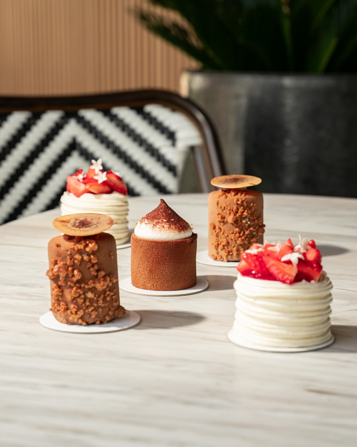 The mini sweet selection is led by Chef Andrea Bonaffini’s signature creations. A Strawberry Short Cake offers a light balance of silky choux biscuit, strawberry gel, sublime cremè, white chocolate whipped ganache and fresh strawberries, while the Pecan · Caramel · Vanilla decadently layers pecan praliné with tonka vanilla mousse, pecan crunch and Dulcey chocolate for a warm, indulgence.