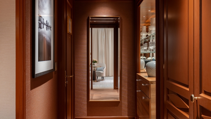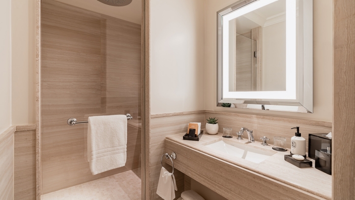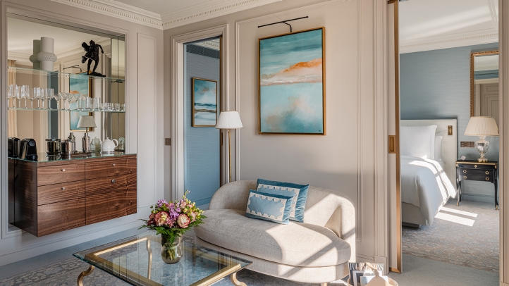 Each room has been conceived as a true living space, imbued with the warm, effortless atmosphere of a private home. The rooms unfold with a natural sense of flow, inviting guests to settle in, unwind, and inhabit the space as freely as they would in their own residence. An elegant table replaces the traditional desk, adapting with ease to every rhythm of stay—whether used for sharing a meal, working in quiet comfort, or enjoying a moment of conversation. A refined in‑room bar further enhances this distinctly residential experience, inviting conviviality with a selection of pre‑mixed cocktails and beautifully curated glassware. Decorative details, chosen with care, blend contemporary artworks with pieces from the hotel’s historic collections, subtly extending the story of the place.