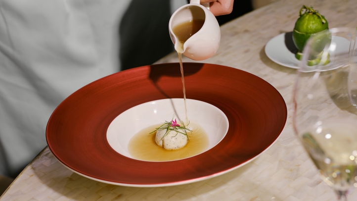 另一道Liven独具匠心的创作则是椰汁鸡汤伴以黑松露鸡肉球与柠檬叶。从泰式料理中获得灵感,将老母鸡与香茅、柠檬叶、番茄同熬六小时制成汤底,色泽澄澈。鸡汤浸润鸡肉球,入口微酸微辣,如和煦阳光,不同于冬阴功的热烈。Liven反复调整柠檬与香料的比例,只为找出恰好平衡的清新滋味。