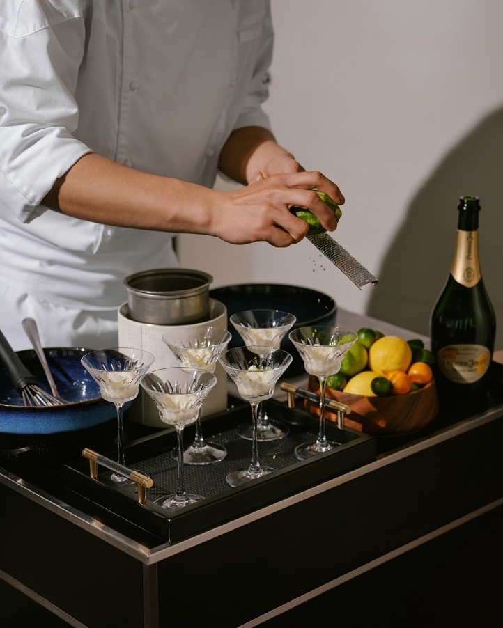 香煎银鳕鱼搭配柠檬酒冰沙是限定搭配。宾客可选择自己心仪的柠檬品种请大厨现场制作冰沙,感受多种柠檬的细微风味差异。甜品则呈上一整颗完整的黄柠檬,Liven将柠檬果肉掏空,完整外皮经糖渍煮制,褪去了原本的坚硬苦涩;内部填以柠檬慕斯与柠檬凝乳,置于柠檬风味的松脆之上。