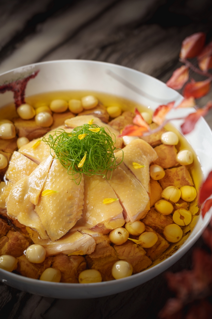 汤品“杏汁白果肚尖炖花胶",以自制杏汁融入老鸡排骨高汤,搭配白果、花胶与肚尖慢炖,汤色乳白温润,尽显秋日滋补之雅。"山椒油红焖舟山九节虾"选用本地九节虾,肉质紧实,借木姜子油、刺芹提味,传统红焖后香气馥郁,一份四只兼具分量与仪式感。"酸汤芙蓉蛋花胶手拆白蟹"工艺精巧,红酸汤蒸蛋羹为底,加入手拆蟹肉与花胶,酸香与鲜润交织,演绎鲜味盛宴。 “家烧慈溪红菱米"取当季红菱,家常慢火焖煮,糅合蔬果与酱香,保留红菱清甜绵糯,满含江南秋意。主要以零点供应,适用于2025年9月15日至12月14日。