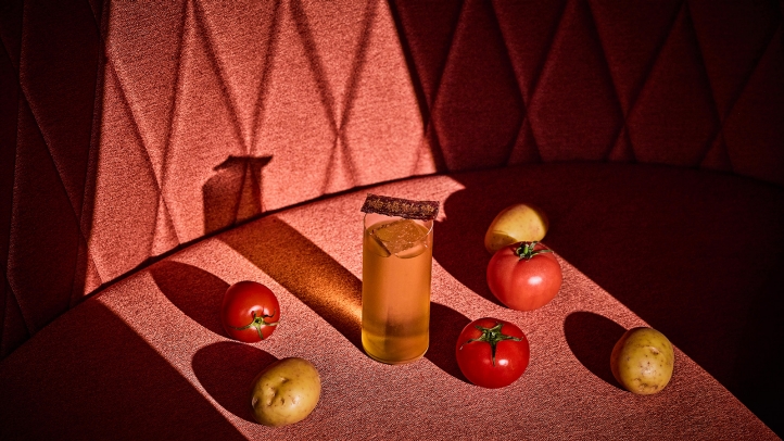 The Pickled G&T leans savoury from the start, spotlighting pickled kale in its first iteration. Gin is blended with shochu and Riesling, and served alongside crisp kale chips, it reframes the classic highball with a briny edge. Bright and bracing, the acidity cuts cleanly through the structure, keeping it tight and balanced.