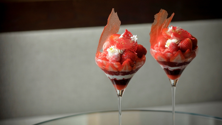 Winter Strawberry Parfait. The season’s finest strawberries, including Amaou, reveal their full brilliance in a symphony of taste and texture at The Lounge & Bar. This artfully crafted parfait unfolds layers of fresh strawberries, slow-cooked berry compote, fragrant tonka cream, and refreshing lychee jelly – all finished with a gossamer oolong tea espuma and a crunchy almond crumble.