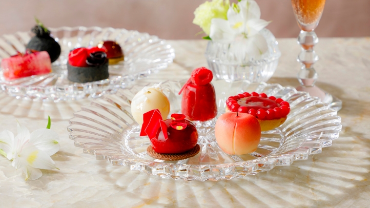 メゾンを象徴するシグネチャーカラー「レッド」をテーマに、エレガントに仕上げた3段のティースタンド。