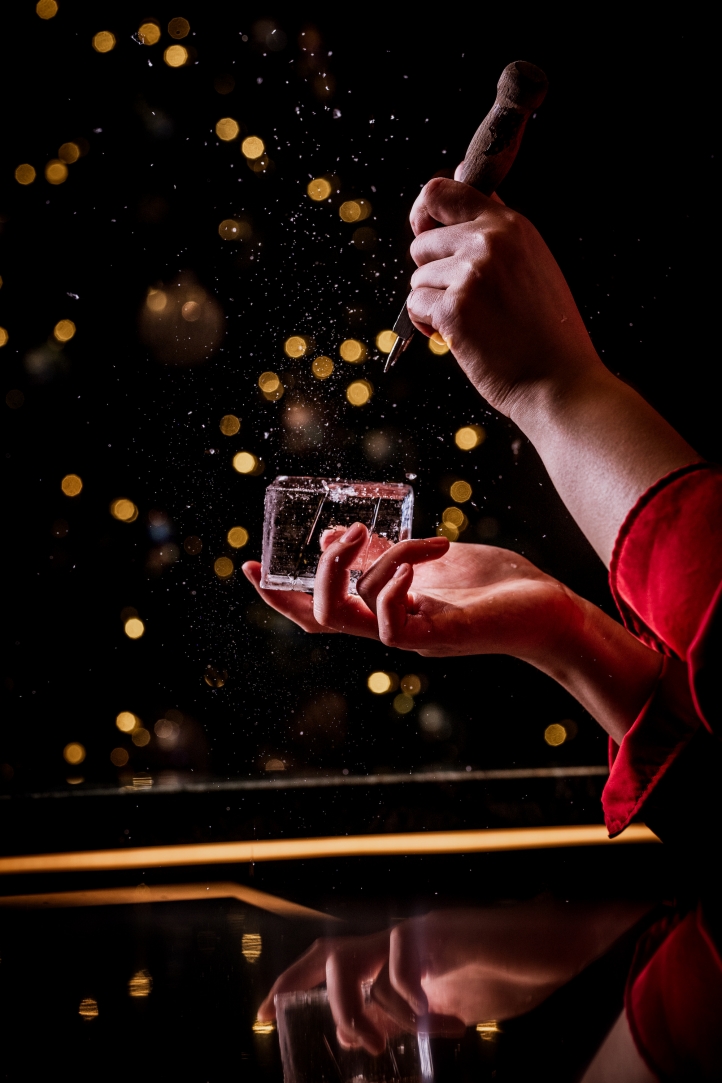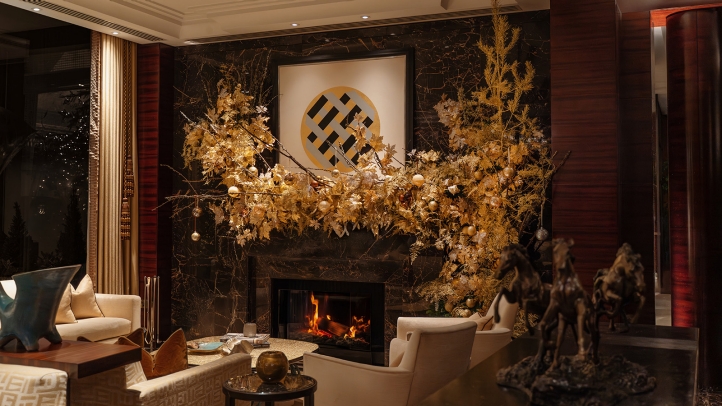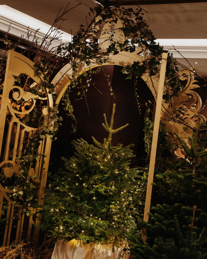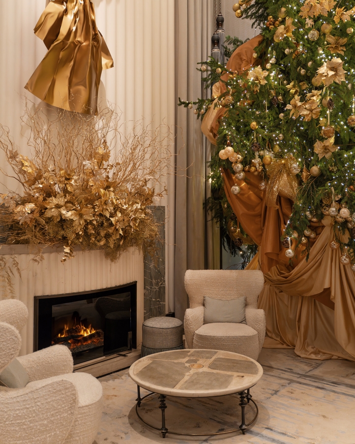 From the moment guests are welcomed inside, they are greeted by an enchanting winter tableau in the lobby: a snow-dusted gate, a single frosted tree, and a softly glowing lamppost guiding the way to the hotel’s Pavyllon Lounge. Here, a towering Christmas tree shimmers with crystal drops and glass baubles.