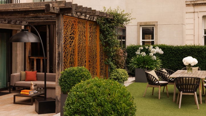 - The Royal Terrace Suite is a rarity in the capital, offering a vast private garden terrace - ideal for entertaining or peaceful moments in nature in the heart of Mayfair. A separate dining room and well-appointed pantry provide the perfect setting for intimate gatherings, while handcrafted furnishings and bespoke finishes reflect Four Seasons craftsmanship. Sycamore panels and gold walls create a warm, light-filled interior that opens seamlessly onto the landscaped outdoor space