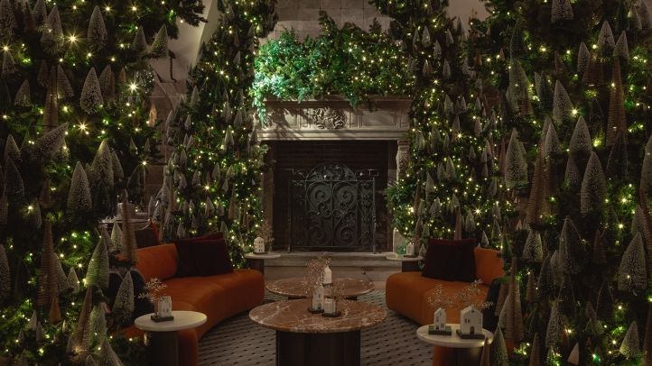 An enchanted path comes to life throughout the hotel, from Stilla Bar to Zelo, where a magical forest of trees in refined shades of green and delicate golden accents guides guests on a sensory journey. Giant elves in pine-green and ochre velvet, backlit wooden cottages, and velvet-covered stars shape a world suspended between dream and beauty, with each space telling its own Christmas story. A pathway of peaks leads guests to Sala Camino — transformed for the season into the Room of Stars, where time stands still.