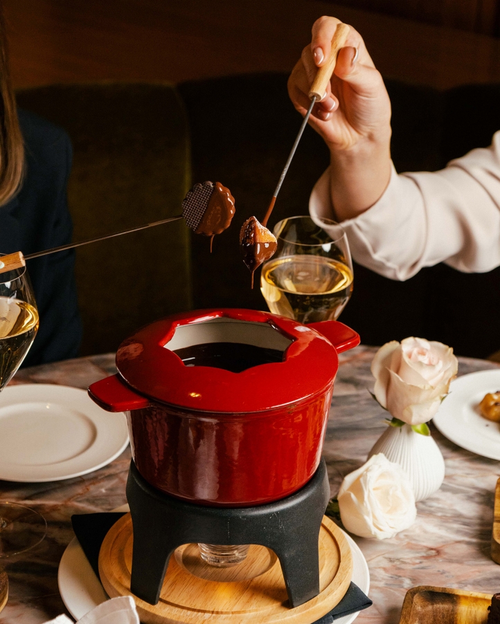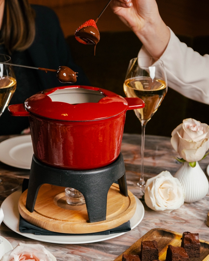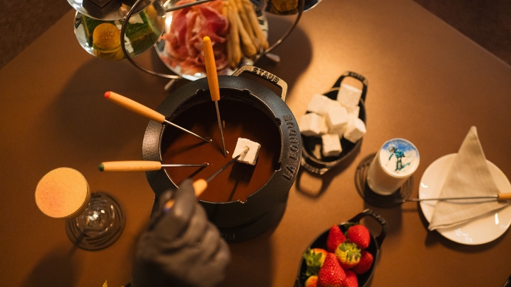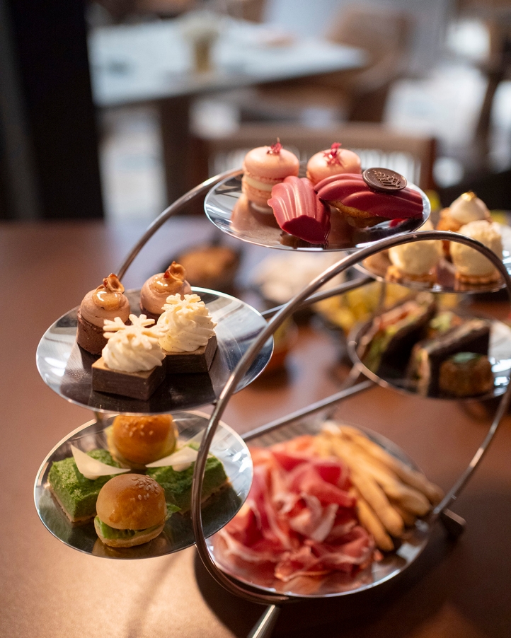 The winter experience continues and after the fondue, guests can taste a tiered stand, which includes savoury bites - seasoned prosciutto and breadsticks; a sandwich with guacamole and smoked salmon; spinach and Parmigiano Reggiano quiche chicory croquettes with anchovy mayonnaise; black bread sandwich with chicken, tomato, and lettuce – and sweet delights: chocolate madeleine, raspberry inspiration, exotic Rocher, coconut and Madagascar vanilla sable; Piedmont IGP hazelnut tartlet, 43 percent Jivara chocolate and tonka bean; choux with salted caramel chantilly, 35 percent Dulcey blond chocolate and mascarpone cream; strawberry and rose petal macarons, 70 percent Guanaja chocolate, bombardino and Valtellina cream.