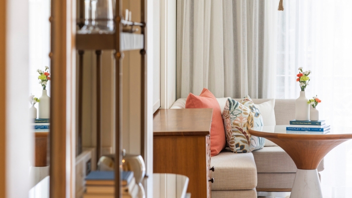 Each of the resort’s 220 guest rooms and suites blends exquisite natural materials, neutral palettes, and curated textures to reflect the surrounding landscape and water. The high-ceilinged guest room interiors channel the tranquillity of the coast with painted wood paneling, carved teak consoles, upholstered banquette dining nooks nestled beneath sea glass chandeliers, and bespoke cabinetry in flamingo pink or periwinkle blue lacquer housing the in-room minibar. Each guest room offers an expansive ocean view terrace fully furnished with plush daybeds and dining areas for fluid indoor-outdoor living. Generous walk-in closets with custom leather, woodwork and integrated lighting further enhance the residential appeal.