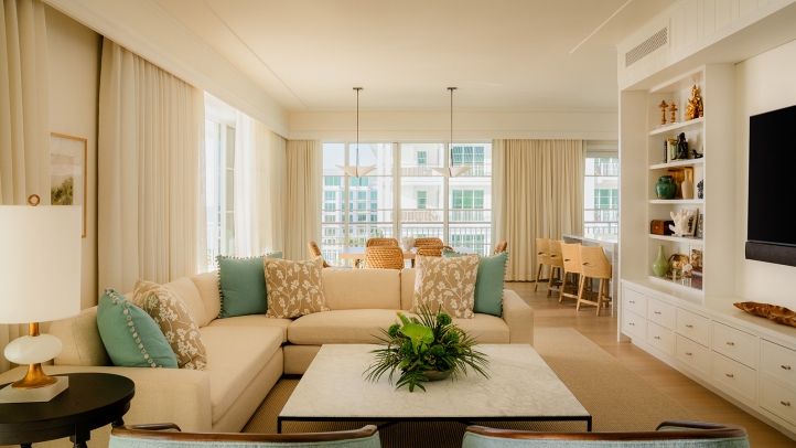 Designed by award-winning Champalimaud Design, the Sabal Suite channels the relaxed elegance and coastal beauty of Naples through a tailored palette of warm neutrals inspired by the resort’s pristine shoreline. Accents of turquoise and light blue reflect the blending of sea and sky, alongside verdant hues drawn from South Florida’s native landscape. A dramatic double-height foyer announces the suite's sense of occasion, while the expansive sea-facing terrace includes a shaded rooftop veranda with separate lounging and dining areas, dissolving the boundary between indoors and out. In its central entertaining space, a coral-hued lacquer bar with a marble counter and antique brass accents anchors a living and dining layout conceived for elegant, multigenerational gatherings within a residential setting.