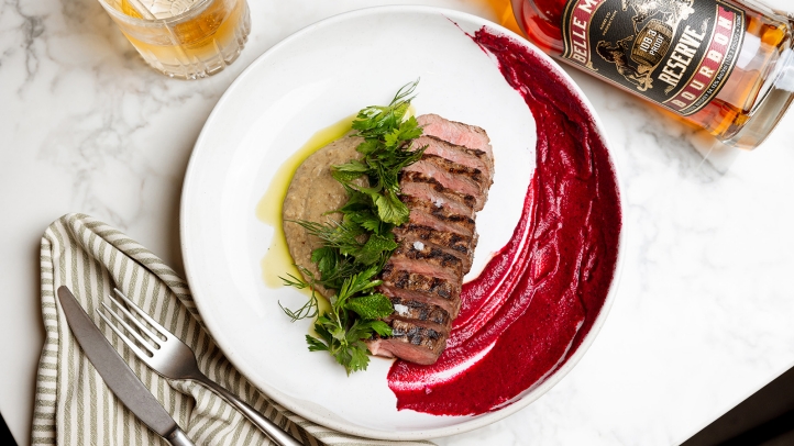 Chef Derek Simcik will present the main course of Lamb Shank with smoked eggplant purée and a deep burnt beet BBQ sauce. The Belle Meade Sour with Reserve Bourbon, Beaujolais, burnt-sugar syrup, Amaro Cardamaro, and lemon offers a tart, fruit-driven contrast.