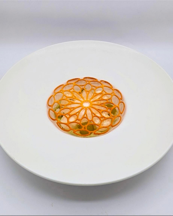 Honeydew Yogurt Espuma - A favourite of Chef Macke, this ethereal creation begins with a base of Pandan Coconut Sauce paired with sous vide compressed honeydew spheres. Lanai Honey Vanilla Semifreddo spheres, crafted using honey sourced from beehives on the island, are layered throughout. A velvety Greek yogurt espuma completes the dish, finished with honeydew granita flakes and a salted toasted rice tuile that delivers a savoury crunch in every bite. Monk fruit sweetener reduces overall sugar content, resulting in a gluten-free dessert that is both mindful and flavourful.