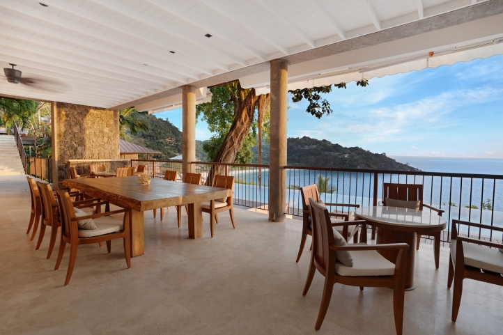 A standout feature of the villa is its beautiful infinity pool, which cascades toward uninterrupted views of Petite Anse beach and the ocean, creating a serene and cinematic setting for relaxation and connection. The main living area, positioned on the uppermost floor, enjoys sweeping coastal views and breathtaking sunsets that flood the space with natural light. An expansive outdoor living area with a separate bar further enhances the villa’s appeal and can be set up in multiple configurations to suit events, celebrations, or relaxed family gatherings, all framed by stunning ocean backdrops perfect for entertaining or unwinding. With six full bathrooms and an additional powder room, the villa provides exceptional comfort and convenience for those hosting larger groups.
