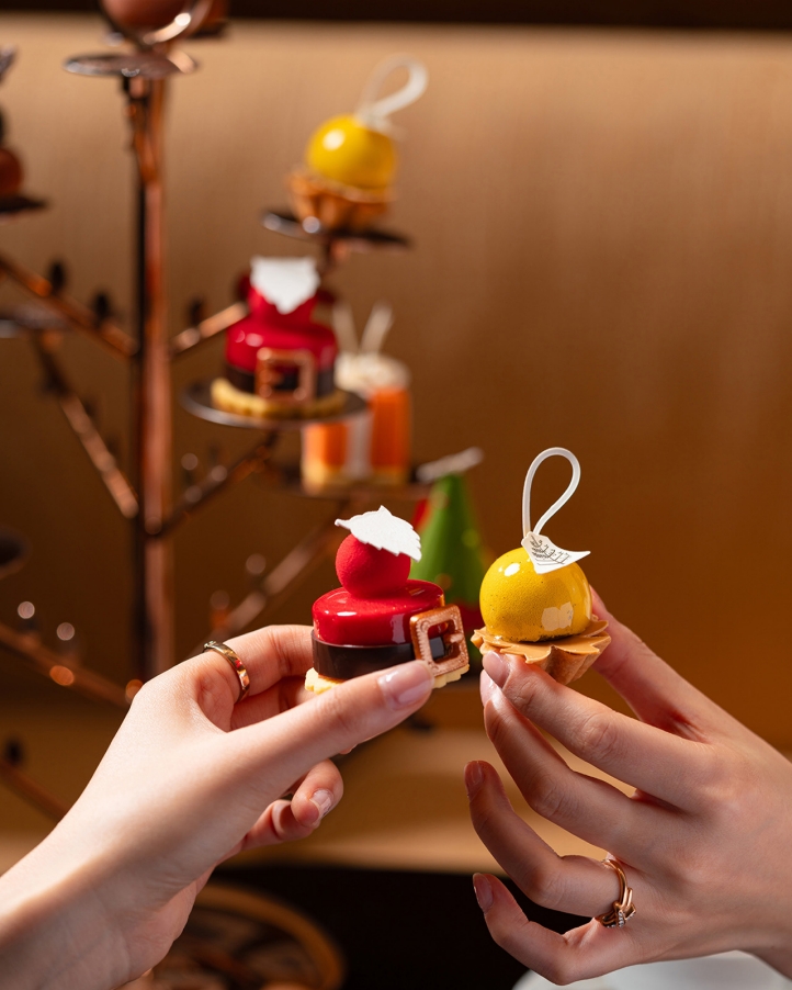 La Sala serves a limited-edition Christmas Afternoon Tea, transforming festive cheer into sweet indulgence. The set features a Caramel Apple Cinnamon Mousse wrapped in an adorable orange gift box, a Matcha Cheesecake sculpted as a miniature Christmas tree, plus savoury treats such as Christmas Ham and Asparagus Rolls, and a Shrimp Tart with caviar.