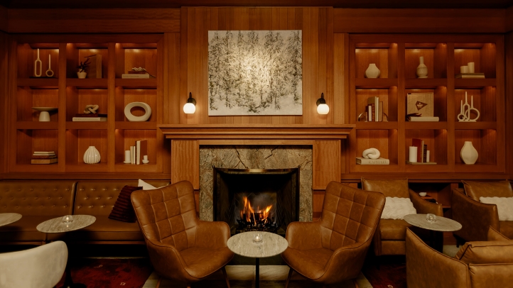 The Library has been reimagined as a warm, elegant haven, where rich red and gold accents infuse the space with refined charm. Anchored by its signature open fireplace, the space offers intimate seating and bespoke bar details for a refined après-ski retreat. Guests can pair rare pours with light bites or enjoy carefully crafted zero-proof creations, ensuring every palate is catered to.