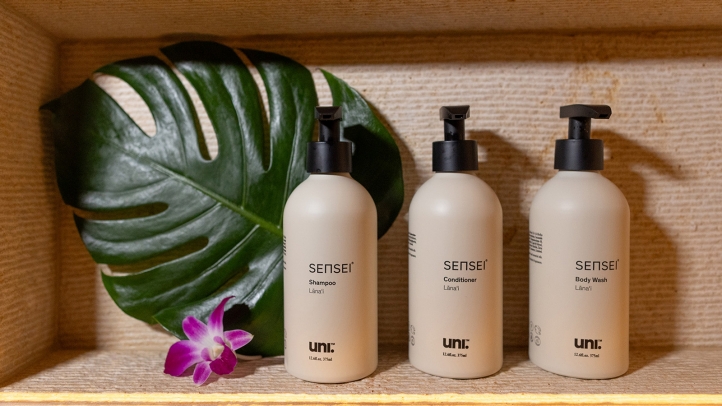 The guest rooms at Sensei Lāna‘i, A Four Seasons Resort offer a relaxed, yet sophisticated ambiance, with many overlooking lush gardens with views of the towering Cook pine trees or outdoor sculptures. Bathrooms feature vanity consoles with carved stone tops, custom fixtures, dimmable lighting, rain showers, Toto washlets and signature Sensei bath amenities