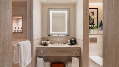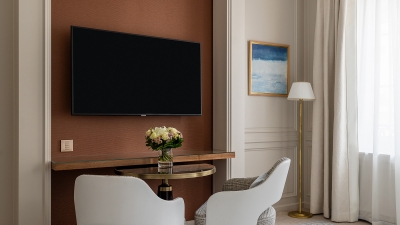Each room has been conceived as a true living space, imbued with the warm, effortless atmosphere of a private home. The rooms unfold with a natural sense of flow, inviting guests to settle in, unwind, and inhabit the space as freely as they would in their own residence. An elegant table replaces the traditional desk, adapting with ease to every rhythm of stay—whether used for sharing a meal, working in quiet comfort, or enjoying a moment of conversation. A refined in‑room bar further enhances this distinctly residential experience, inviting conviviality with a selection of pre‑mixed cocktails and beautifully curated glassware. Decorative details, chosen with care, blend contemporary artworks with pieces from the hotel’s historic collections, subtly extending the story of the place.