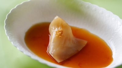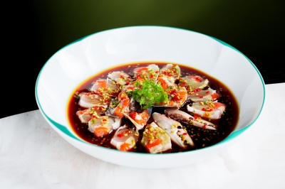 - Marinated Crab, Ginger, Vinegar, Soy Sauce, Liquor – Premium white crab from the East China Sea is precisely cut into eighteen pieces. The traditional marinade is subtly lightened in saltiness, while warm notes of ginger and white pepper add a refreshing complexity — a refined contemporary interpretation of Ningbo cuisine.