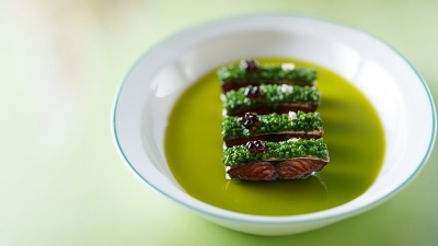 - Marinated Mackerel, Wild Chive Sauce – Seasonal East China Sea mackerel is enhanced with a fragrant leek sauce, expressing the warm, savoury-yet-umami character of a Jiangnan spring.