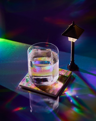 Then there’s Dreamscape, a collaboration with rising Hong Kong artist Tam Mei Yi Amy. The fat-washed coconut tequila cocktail layers hazelnut, coconut, tonka bean, and chestnut into a silky, transparent pour that plays with texture and restraint. Its visual identity is part of the experience: Amy’s artistic style translates her soft palette of lush greens, blush pinks, and clean whites into a custom-painted coaster that mirrors the drink’s mood, while a small post lamp casts a soft glow over the glass, inviting guests to pause before the first sip.
