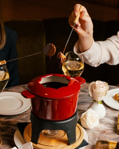 L'esperienza invernale continua e dopo la Fonduta gli ospiti possono assaggiare un’Alzatina che comprende bites salati - Prosciutto crudo stagionato e grissini, Paninetto con guacamole e salmone affumicato, Quiche spinaci e Parmigiano Reggiano, Crocchetta di cicoria con maionese all’acciuga, Sandwich di pane nero con pollo, pomodoro e lattuga – e delizie dolci: Madeleine al cioccolato, ispirazione lampone, Rocher esotico, cocco e sablé alla vaniglia del Madagascar, Tartelletta alla nocciola IGP del Piemonte, cioccolato Jivara 43% e fava tonka, Choux con chantilly al caramello salato, cioccolato biondo Dulcey 35% e crema al mascarpone, Macaron alla fragola e petali di rosa, Cioccolato Guanaja 70%, bombardino e panna della Valtellina.