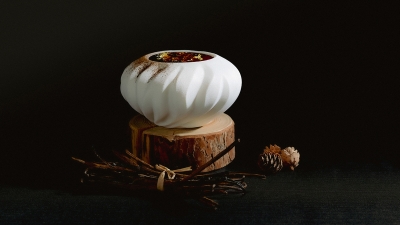 ‘크리스탈 바닐라’(12만 9천 원)는 훈연한 바닐라를 저온에서 천천히 조리해 천연 당분과 오일이 캐러멜라이즈 된 풍미를 살린 케이크다. 부드러운 스펀지에 카카오 닙을 더해 바삭하고 흙 내음 나는 질감을 더했으며, 오아비카 겔로 마무리해 훈연의 깊은 향과 달콤함, 미묘한 쌉싸름함이 조화를 이루는 세련된 디저트를 완성했다.