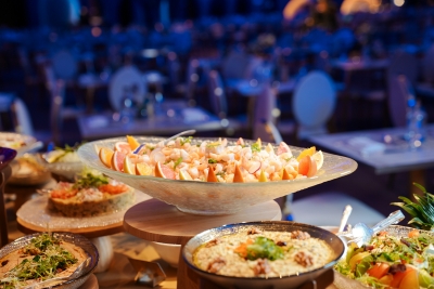 Specially crafted banqueting menus rotate weekly and highlight a vast array of regional and international flavours: Mezze and Salads; Sushi, Ouzi, and Pasta; live Tandoori stations, and premium Date and Cheese selections. A lavish dessert room takes guests on a decadent journey through traditional treats from Turkish Delights, Kunafa and Arabic sweets to ice cream, fresh fruits and a chocolate fountain.
