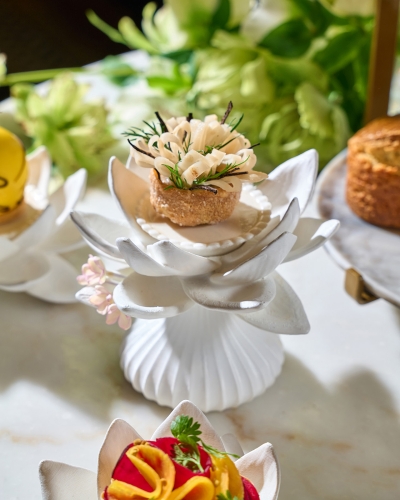 The menu reflects a balance of creativity and seasonality, with a curated selection of savoury and sweet creations inspired by fresh ingredients and delicate floral notes. Highlights include veal tartelette with beetroot and basil, celeriac with mushroom mousse and truffle, and lobster complemented by citrus and parmesan. The sweet selection continues with light, elegant desserts, alongside freshly baked scones served with traditional accompaniments.