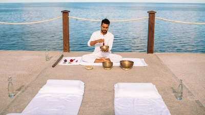 Wellness experiences for couples include the Circle of Connection Spa’s milk-and-honey ritual, featuring Desroches honey and a side-by-side massage followed by a milk-and-honey bath. A curated spa gift is included for each couple. Additional offerings include Couple’s Yoga and Sound Healing sessions, designed to support relaxation and mindful connection.