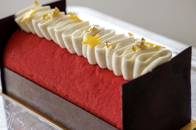 Bûche de Noël - This Christmas-themed composition begins with hazelnut sponge and evolves into layers of gianduja crunch, crémeux and mousse – all enveloped in red chocolate and whipped Chantilly cream.