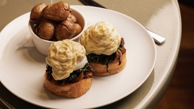 Main courses continue the indulgence with saucisson en brioche topped with a fried duck egg, hot smoked rainbow trout, a caramelized pain perdu with berries and orange caramel, a comforting croque monsieur, and a Benedict with sautéed mushrooms and velvety béarnaise.