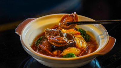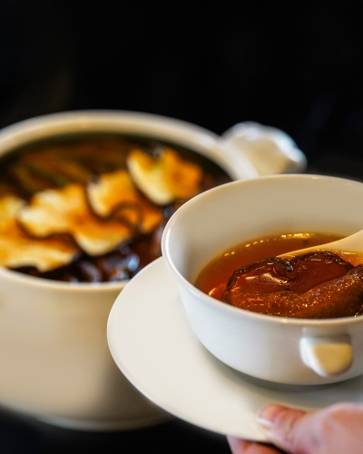 粤韵寻鲜,暖润入馔 米其林一星采逸轩中餐厅厨师团队,以粤式古法为本结合创新巧思应季而烹,演绎盘中的温补之韵。油酱封麻鸭精选肥嫩麻鸭,油酱慢火封焖,浓厚酱香嵌入鸭肉肌理,鲜咸滋味又透出缕缕甘润。辣木苗拌茭白中辣木苗脆嫩爽口,茭白清甜,凉拌更加自然清新,唤醒冬日消沉味觉。雪梨霸王花炖陈肾,封存时间与时令风物,小火慢煨,待沸腾的泡沫散去,沉淀下的,是清洌澄澈的醇香,品一口温润入喉,源自食材的力量滋补入身。取民间俗语“冬吃萝卜夏吃姜”之智,一道豆酱星斑柳闷萝卜尽显食补,细嫩星斑鱼柳搭配多汁萝卜,鲜与甜分层化开,又与豆酱融成一抹冬日暖味,充斥口腔。鲍鱼一品煲集山珍海味于一煲,鲍鱼肉厚弹牙,搭配多种滋补食材慢炖入味,汤汁醇厚丰腴,营养丰足。餐后的甜品是黑松露椰汁芋茸西米布丁,将黑松露的独特香气与椰汁清甜、芋茸绵密交织融合,另有Q弹西米带来惊喜活泼的口感,为这桌暖冬盛宴画上甜蜜句点。